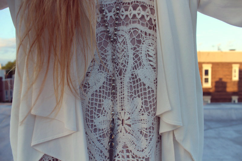 The way that this dress is longer and only has crochet details in the front is not a combo I often see, or.. to think about it, ever really saw before this dress. I was headed to go see Chaplin on Broadway this day so I knew I needed a coat to take with me. I pulled out this little vintage white over jacket with an open crochet back detail and the way they fit together was perfect. Where the dress detail ended, the jacket detail began. I think this is a perfect example of how mixing modern and vintage pieces can truly create a perfect outfit.